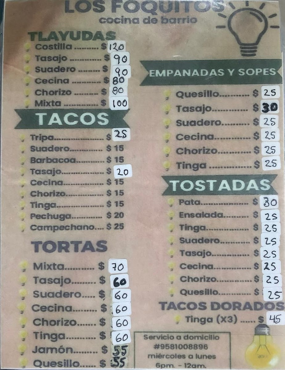 The menu is organized into several main categories featuring traditional Mexican antojitos, ideal for casual dining or quick meals throughout the day. Visitors can explore a variety of tlayudas, empanadas, sopes, and tostadas, each available with different fillings to suit diverse preferences.